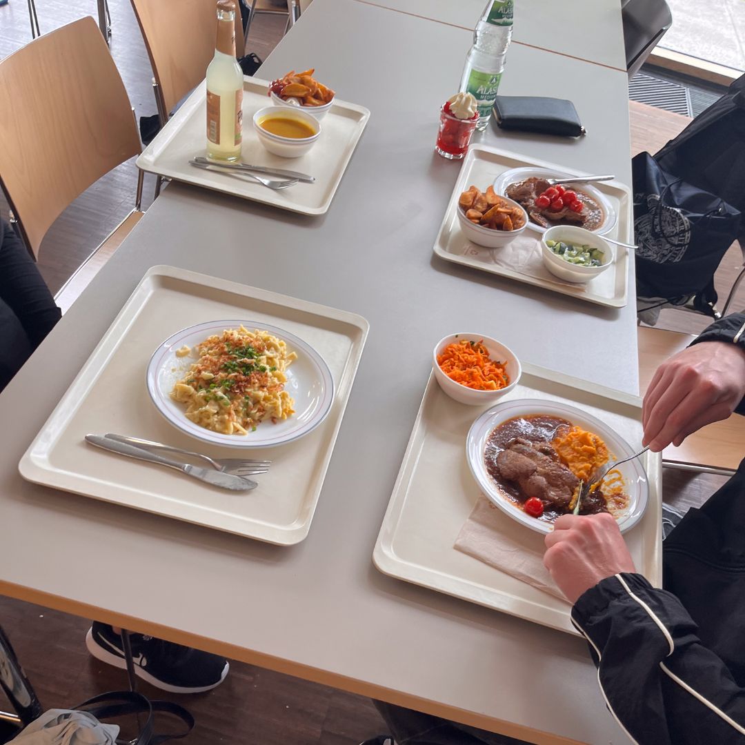 Mittags trafen sich die Tandem-Partner in der Mensa, um gemeinsam zu essen und sich weiter auszutauschen. Dies bot nicht nur die Möglichkeit, sich über das Studium zu informieren, sondern auch, das soziale Leben auf dem Campus zu erleben. Die Tandem-Partner standen den Schülerinnen und Schülern dabei mit Rat und Tat zur Seite und gaben wertvolle Insider-Tipps zur Universität, zur Stadt und zum Studieren in Würzburg.