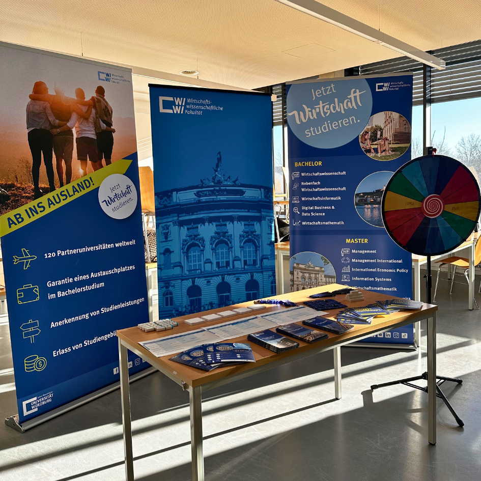 An zahlreichen Informationsständen präsentierten sich die einzelnen Fakultäten und Fachbereiche der JMU. Hier konnten sich die Besucherinnen und Besucher nicht nur über die jeweiligen Studiengänge informieren, sondern auch direkt mit Studierenden ins Gespräch kommen und wertvolle Einblicke aus erster Hand erhalten. Ergänzt wurde das Angebot durch einen Stand der Zentralen Studienberatung, einen Stand des Studierendenwerks sowie das interaktive Format „Ask-A-Student“ Speed-Dating, bei dem individuelle Fragen rund um das Studium beantwortet wurden. Ein besonderes Highlight war die Fotobox, die für Erinnerungsbilder an diesen besonderen Tag sorgte. Auch die Wirtschaftswissenschaftliche Fakultät war mit einem eigenen Informationsstand vertreten und bot interessierten Besucherinnen und Besuchern spannende Einblicke in ihre Studienprogramme.