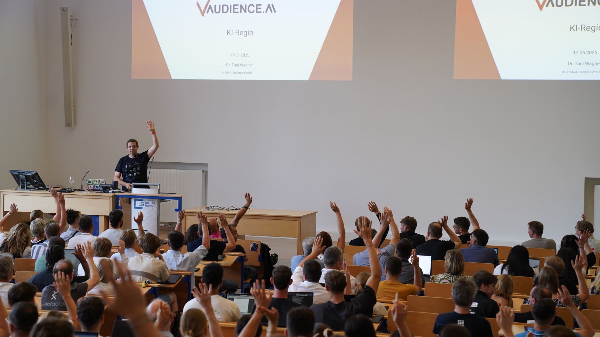 Am 17. Juni fand die Halbzeitveranstaltung des Projekts KI-Regio mit mehr als 150 Teilnehmenden im Audimax der Neuen Universität statt. Ziel der Veranstaltung war es, aktuelle Einblicke in den Entwicklungsstand des Projekts sowie praxisnahe Anwendungsmöglichkeiten Künstlicher Intelligenz für kleine und mittlere Unternehmen aufzuzeigen.